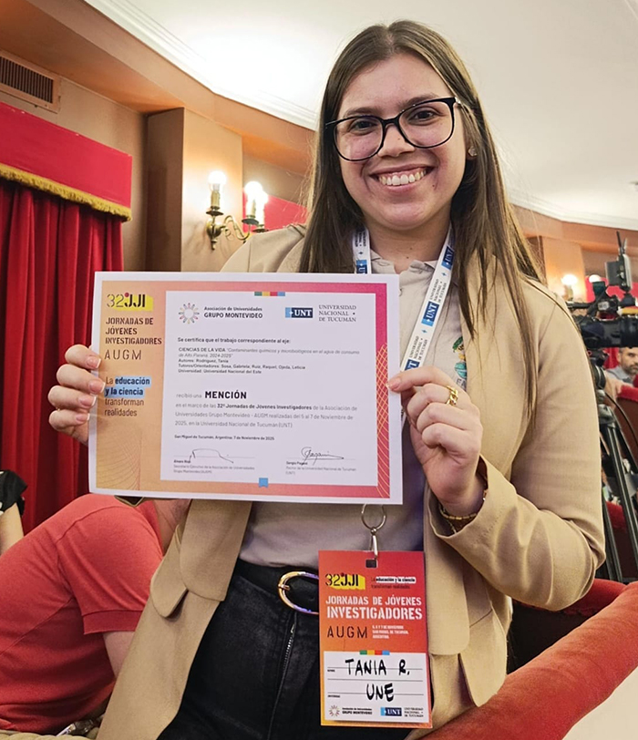 La investigadora Tania Rodríguez Silvero, de la Facultad de Ciencias de la Salud (FACISA-UNE), obtuvo el premio con su trabajo titulado “Contaminantes químicos y microbiológicos en el agua de consumo de Alto Paraná, 2024-2025.”