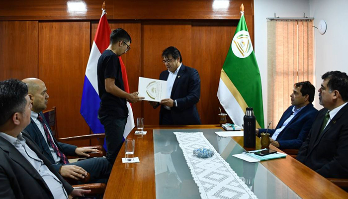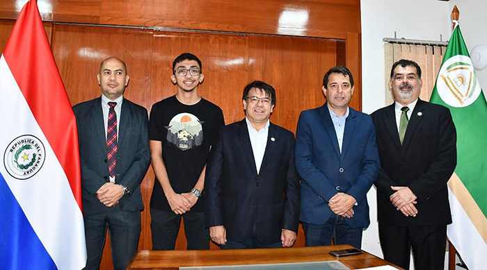 Acompañaron la audiencia, realizada en el Gabinete el 26 de febrero, Prof. Ing. Oscar Espinoza, decano de la FIA-UNE, el Prof. Abg. Ronald Miguel Villalba, director general de Relaciones Internacionales del Rectorado, y el Mag. Luis Cristóbal Chávez Fariña, director general de Comunicaciones del Rectorado.
